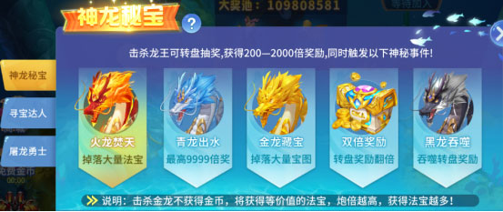 传说在《捕鱼大决战》的某处神秘海底,存在着拥有大量宝藏的神龙一族,而如今宝藏所在地已被找到,击杀神龙及其手下的龙族勇士,可获得海量奖励。所以在神龙秘宝的场景中,大家最期待的就是与神龙BOSS来一场不期而遇的遭遇战了,因为击杀BOSS可获得最高9999倍大奖,更有法宝、藏宝图等您来拿,秒变高富帅。