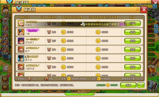 每组显示10位对手,如挑战对方成功即可获得对方金库内1/10的金币,如被对方挑战自己也会损失1/10的金库金币数。每天只可挑战10次。