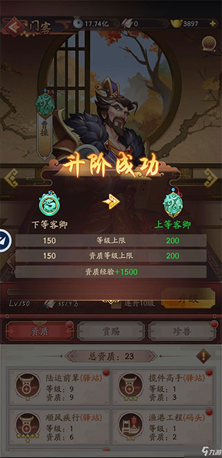 其实在第一天我已经说过了,我们要尽可能的培养一个门客,所有的资质书都给他用,阅历也分出一大半给他,对于主线任务我们基本可以不用理会,但是门客等级越高需要的阅历也是几何倍增长,所以我们可以适当分出去一些零头升级其他门客就可以了(具体分多少自己把握,看消耗阅历的多少和财力的提升),但是所有的资质卷轴一定要给一个主力,还有所有的书都给主力(珍兽百分比加成影响书籍财力)