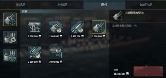 正所谓好马配好鞍,战舰配件的选择也非常重要,游戏中每艘战舰可以选择三个不同的配件,可以根据需要进行搭配,例如战列舰装填时间较长,可以选择主炮组修改减少装填时间,驱逐舰隐蔽要求较高,可以选择隐蔽系统修改。