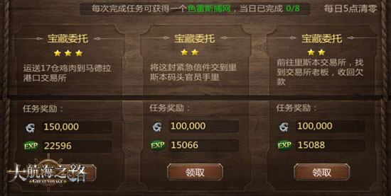 在体验“商会委托”收集珍贵物品赢得奖励的同时,所有等级达到32级的航海家,可以在消息灵通的酒吧老板处,领取内容丰富、难度各异的“宝藏委托”任务。宝藏委托的任务分为1/2/3等级,包括运送交易品、运送客人、投资、催债、战斗等丰富形式,星级越高则任务的奖励越丰富。任务完成后,玩家还会会获得色雷斯捕网珍贵道具奖励(在海上使用,一定几率捞到珍稀物品)。