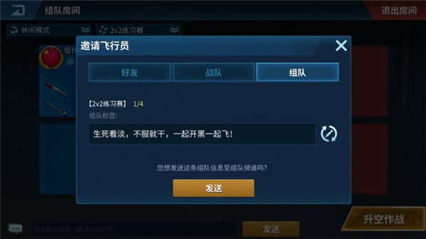 输入组队标签,也可以随机生成系统标签,点击发送按钮后,在组队频道里就能看到你的组队信息了。