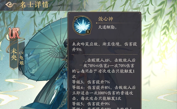 敛心神(被动技能):未央获得6%的伤害提升,击败敌人后会有一定概率追击一次普攻(每回合限追击一次)。