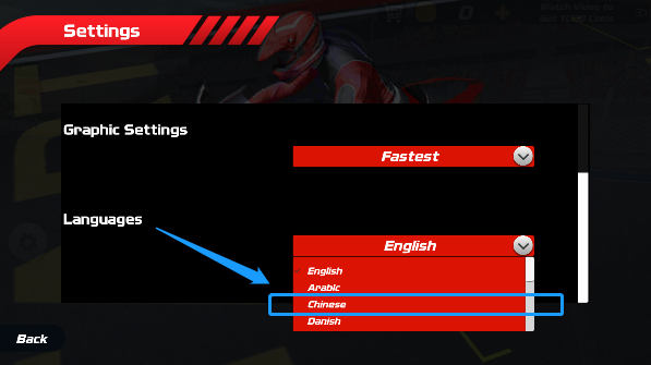 2、在语言设置选项下,我们将其切换为中文显示,具体操作如下图所示,除了语言以外,游戏内的显示画质也可在此设置