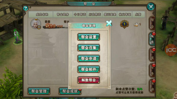在帮会—成员界面,点击帮会管理,还可以多方面进行帮会管理,包括“帮会设置—可以设置其他玩家加入帮会是否需要验证,及加入所需等级”,“帮会召集”,查看“帮会申请”列表,发送“帮会邮件”。同时也可以领取帮会所获得的成就。