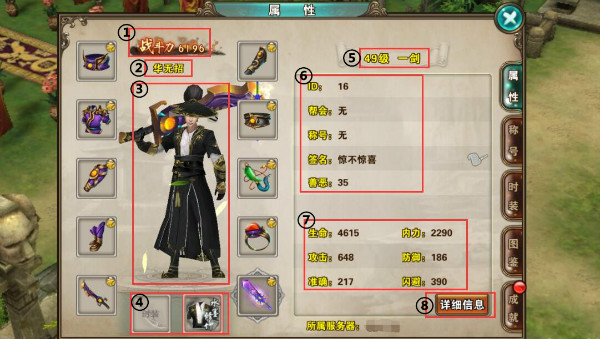 6、角色基本信息——依次为“角色ID”、“帮会”、“称号”、“签名”、“善恶”。其中“角色ID”是大侠遇到问题反馈客服需要提供的重要信息,请牢记哦。“签名”则可以根据自己的心情状态自定义呢。