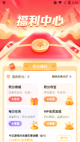 用户参与获得即可获得相应的积分奖励,获得的积分可以免费兑换平台币、充值卡等奖励,免费对游戏进行充值