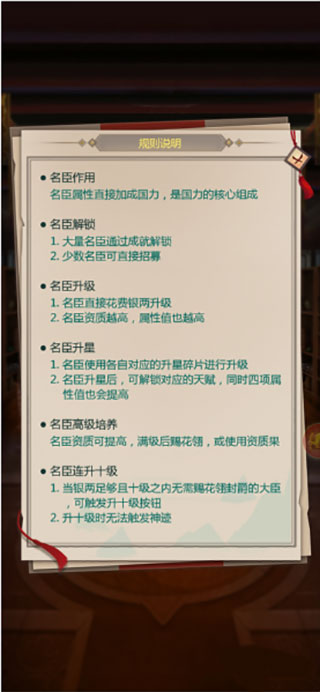 1、每个大臣的配点阶段都有三次,分别为100级、120级、150级,在这三个阶段玩家都要给大臣进行配点,配点建议玩家先加军略方面,这样玩家在军事方面的胜算会大一些,其他方面的就根据自身而定,配点加好了能大幅度的提升国力。
