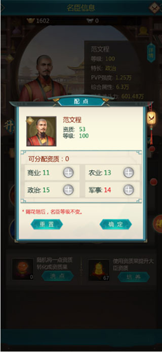 玩家首先需要把自己所拥有的大臣升级到100级,级数达到要求后玩家就可以给该大臣赐花,赐花完成后,玩家就可以给大臣配点了,配点共有四项分别是:商经、农典、政论及军略,玩家给大臣配点主要还是看大臣的特点,大臣如果擅长军事就给军略加点,用一句通俗的话来说就是把自身的优点扩大到最大化。