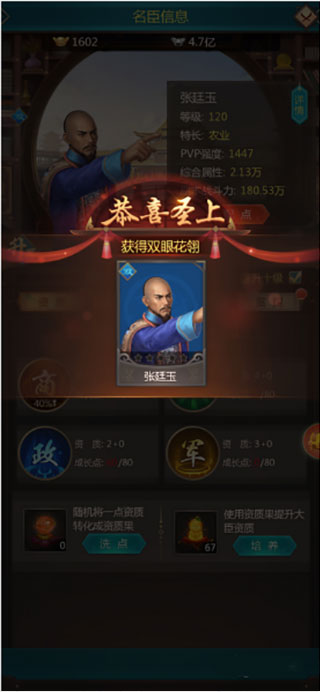 3、给大臣赐花后玩家的级数是不会归零的,还是保持原来的级数,需要玩家在继续升级,配点后玩家就拥有了可以洗点的点数,玩家在使用洗髓丹后可将大臣的一点资质转换成资质果来使用,所以玩家要多使用洗髓丹。
