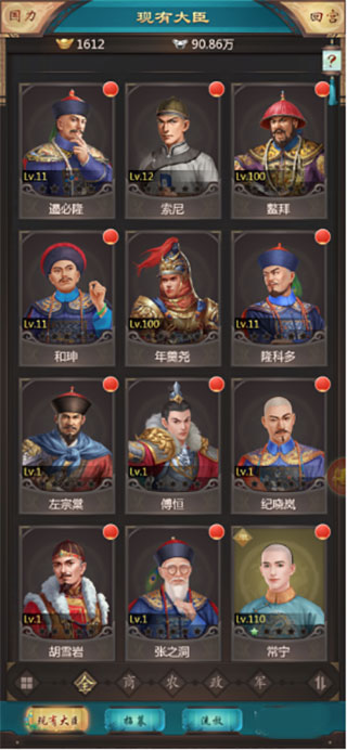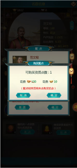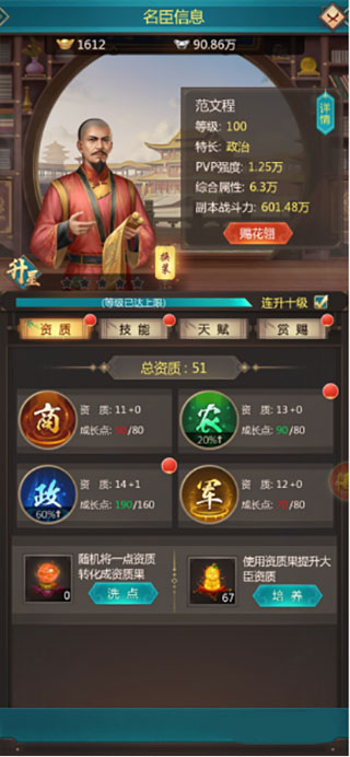 2、配点后,国力会大幅度的提升,当然大臣自身也会提高很多,但是玩家如果想让外郊的推图快点,更能容易的打下城池获取更多资源,那么小编建议大家多加军事,军事足够后再加其他。