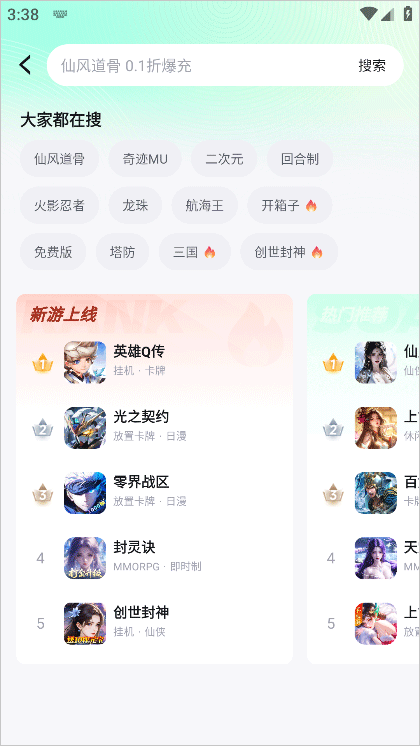 2、精准搜索筛选:设有便捷搜索栏,玩家输入游戏名称、类型关键词,能精准定位目标游戏。同时提供丰富筛选条件,依游戏热度、上线时间、付费类型等筛选,从海量游戏里高效找到想玩的内容。