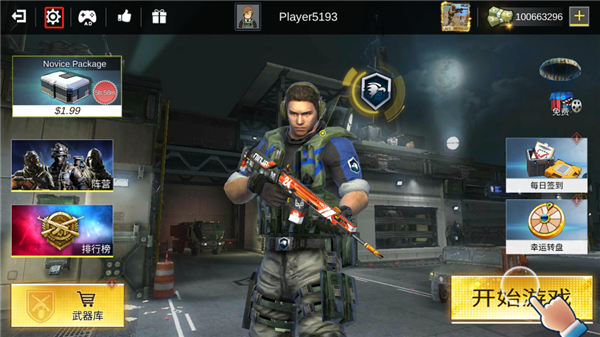 1、打开在本站下载的打击力量英雄最新版,进入首页我们可以看到有阵营、排行榜、武器库等等功能板块,我们可以先点击齿轮状的设置键