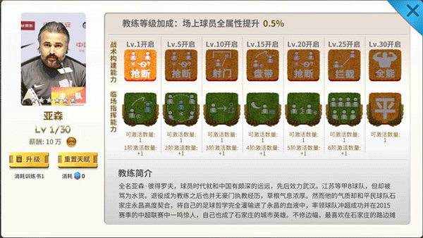 教练系统开启等级需要30级,等级达到后可以免费获得目前石家庄永昌队的主教练亚森,花费一定金额就可以雇佣了。