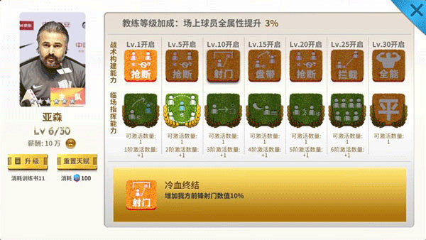 教练星级越高越强力,签约金额也越高。使用教练训练书可以升级教练,解锁更多能力,获得更多属性加成。注意下战术构建能力和临场指挥能力每次只能开启一种哦!如何搭配就要看自己的战术选择啦!