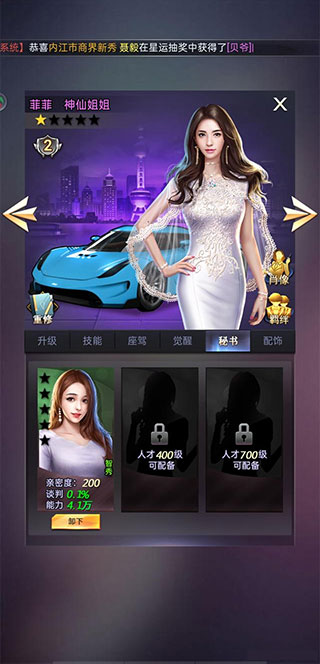 再来说一说秘书的玩法,当建筑科技达到13级并且身份达到商业精英即可解锁秘书玩法,系统会赠送5个秘书,每一个秘书都能装备到人才界面里,进一步加强人才的能力,秘书也是可以升级的,当人才达到100,400和700级时,就可以装备更多的秘书