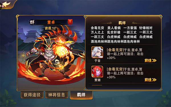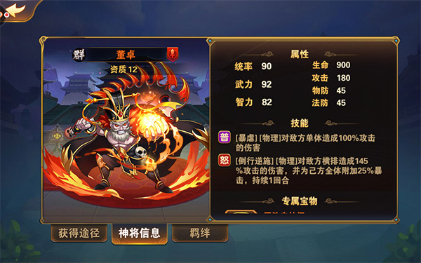 特性8攻击中毒目标60几率减怒25,这个技能描述看似美好,但是实际不行。这个技能触发除了普攻,大招也能触发。但是由于董卓是先手,除非后手,不然大招不容易触发。而且触发方面,需要刚好面对董卓的前排中毒,才会被董卓打到,才会有机会减怒。且经过实际测试,减怒的几率并没有60那么高,大概在50左右的样子,可以说技能并没有想象的那么给力。