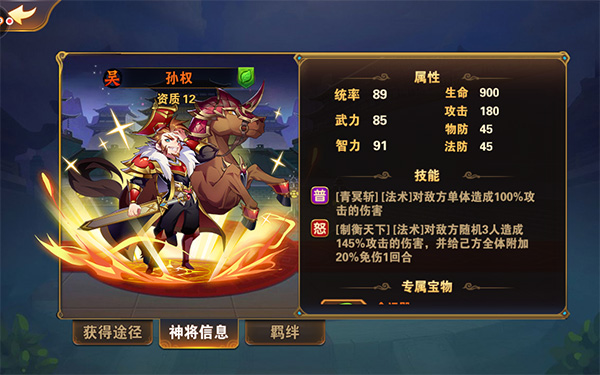 特性8,普攻60%几率给血最少的2个队友回复75%攻击血量,很多吴国觉得这个不好,其实不然。首先60%几率不算少,触发方面还是可以的。且回复血最少队友,也能保证生存率。而75%*2=150%,比起刘备大招也就少90%。而且关键是回血集中。有些人会说刘备回血稳定,但是刘备需要开大才能回,而孙权普攻就有几率触发。总的来说,这个特性是很不错的。