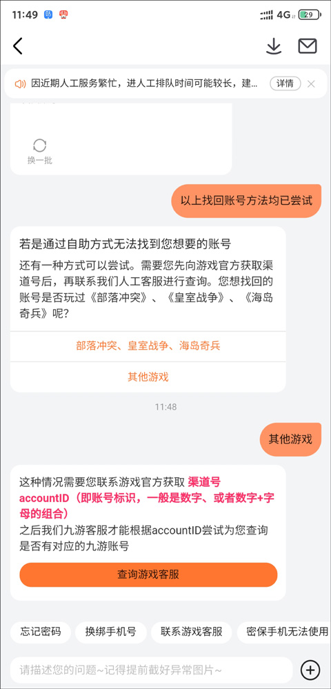 6、你可以根据你的需要来进行找回,诺还是不行则可以先向官方获取渠道号后联系人工客服进行查询