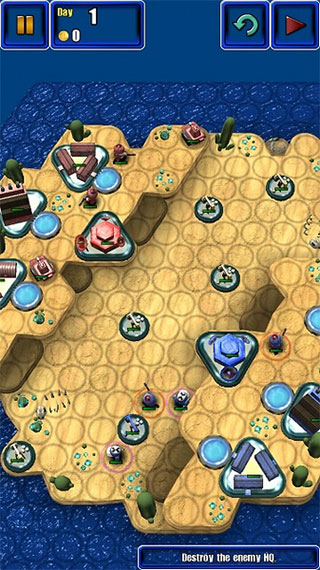 在游戏中玩家需要选择一个阵营,游戏分为红蓝两个阵营,玩家要在关卡地图中进行战斗,你能够通过基地生产战斗单位,让你拥有源源不断的兵源,而且游戏中的士兵是存在克制关系的,玩家召唤不同的士兵组成混合战队,这样可以应付大多数的局面。