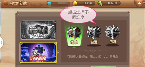 秘境宝藏有两种玩法,每周一三五为可获大量金币的侠盗试炼,每周二四六为可获大量经验的防守恶魔,玩家每天有两次挑战次数。