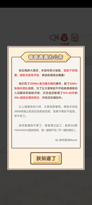 1、下载安装本站提供的我的开挂人生游戏,进入游戏后会看到游戏的公告;