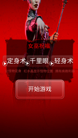 进入游戏后我们可选择女巫祝福,其一共包含定身术、千里眼和轻身术三个技能,其技能对应的效果游戏内已给出,玩家可自定义的学习至多三个技能,学习的技能越多游戏的难度也会越低