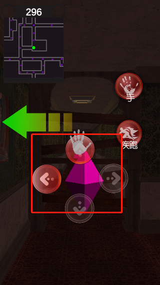 游戏内我们需要通过方向指示按键控制角色的移动,“手”可定身附近的怪物,“疾跑”可快速移动,躲避怪物的追赶