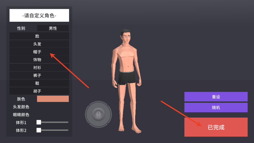 2、进入游戏,玩家可以自定义角色,支持设置脸、头发、肤色、体型等等;