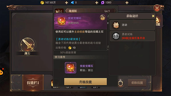 技能觉醒石主要有两种获取途径,一个是游戏当中的各类活动,另一个则是80级主线开通的勇者试炼,完成副本便有极大概率获得技能觉醒石,使用一个石头便可为技能加上一个点数。