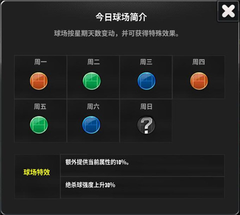 (每日场地加成提供总属性10%+绝杀球30%提升强度,三种场地各一个保证不管任何一天都能均衡实力发挥,不会大起大落)。
