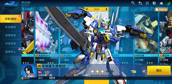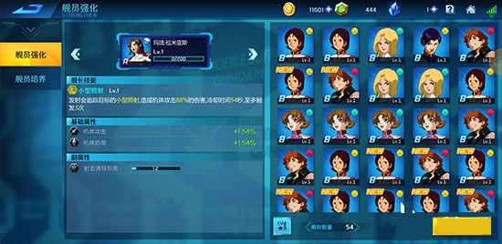 第二个方面就是机师的升级还有升星了,方法和机体强化一样,这方面的升级主要放在机体升级的后边,还有就是最好先给常用机体的专属机师升级还有强化,这样在对战的时候属性加成会很高。