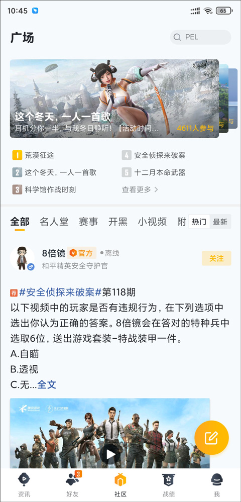 和平精英相信不少玩家们都十分熟悉了,这是一款多人在线吃鸡竞技类型的游戏,但是想要玩好它却不是一件容易的事情,不仅需要玩家的反应能力,还需要玩家熟练的手法操作,对于新手玩家来说想要快速上手还是非常困难的。为此小编今天给大家带来了和平精英营地工具手机版,这是腾讯官方专门为喜爱和平精英游戏的玩家们所打造的一款手机游戏资讯阅读软件,为玩家提供了社区交流、资讯攻略、玩家动态、游戏资料等多种实用功能,包括各种大神攻略、视频解说、玩家动态等多方面的文章内容,随时掌握第一手资源,更轻松的玩转吃鸡世界。