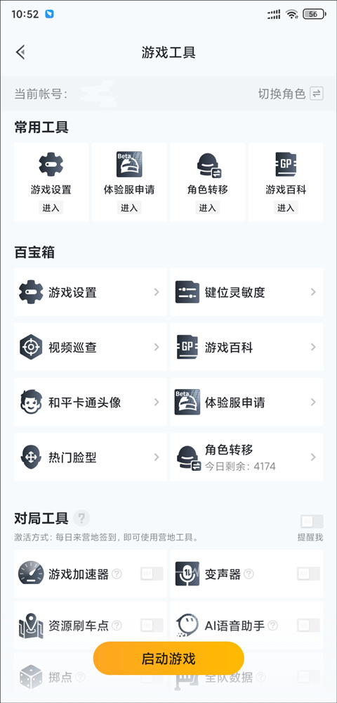 4、拥有百宝箱以及对局工具两大板块,其中百宝箱拥有游戏设置、键位灵敏度、视频巡查、游戏百科等等八大功,而对局工具也拥有游戏加速器、资源刷车点、Al语音助手等等等等八大功