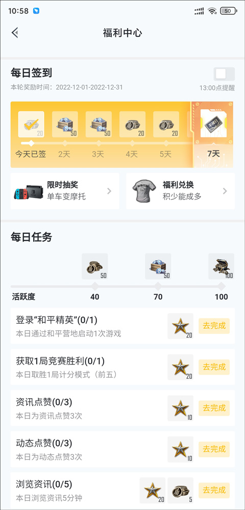 点击首页的福利中心,可以看到每日签到和完成每日任务可以获得营地装饰碎片。