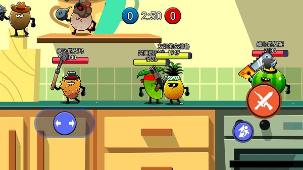 1、操控水果人躲避或者攻击,密切配合队友,获得更多击杀次数!