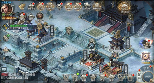 玩家在主城有皇宫、资源市场、战功商店、武将商店、公告板(国家任务)、武将酒馆(抽卡)、元宝商店;