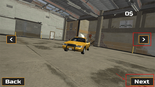 1、在游戏开始前,你需要先选择一辆喜欢的出租车,点击【>】可以切换车辆,选择完成后点击next