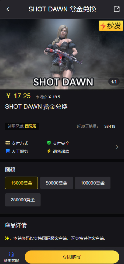 3、进入购买页后,选择需要购买的赏金面额,点击【立即购买】按钮并完成支付;
