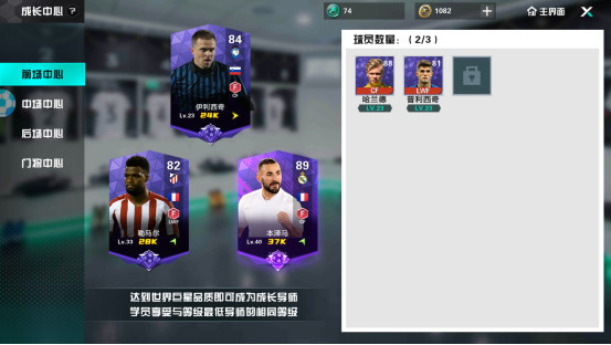 成长中心分为4个子中心,分别对应球员4个位置。将球员放入成长槽后,可提升球员等级。值得注意的是,如果离开了成长槽,球员等级也会恢复哟。