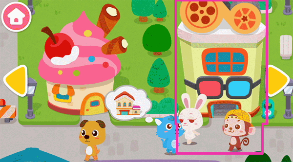 宝宝梦想小镇是宝宝巴士专门针对年龄在4岁到5岁的小小朋友们设计和开发的一款益智类游戏,游戏将带我们走进一座奇妙的梦想小镇,在这里,我们的小小朋友们可以拜访六座大型的公共设施,这六座建筑各有其用,让小孩游玩的过程中明白这些建筑的作用。游戏一开始我们就在小镇里面了,从左往右分别是游泳馆,在这里,我们可以按顺序让小动物从进入游泳馆到开始玩水的整个过程以游戏的形式进行教导,让小孩大概明白去游泳馆的基本步骤。