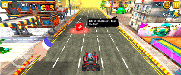 3、点击左右按钮移动收集“油桶”来增加油量,当左上角的油量清零时,一局游戏结束;