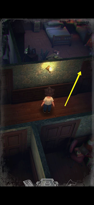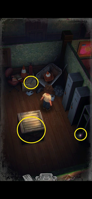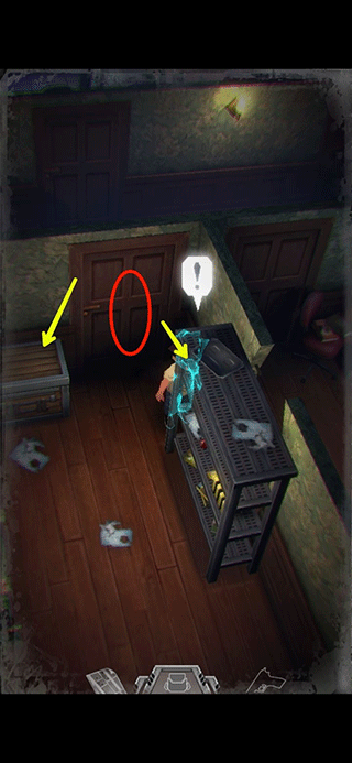 箱子是储物箱,可以存储物品(男主的背包容量有限,可以把暂时用不到的东西装进储物箱)。杂物间的门需要钥匙,用红圈标识。走到如图所示的位置,按照箭头的方向面向这个铁制置物架,松开,长按屏幕任意处就可以朝男主面向的方向推动物品,把架子推开后,从墙壁空缺处走进另一个房间。
