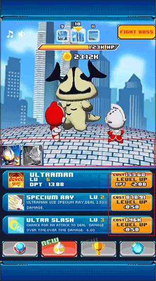 2、你可以切换奥特曼来进行攻击,下方可以用金币来升级和获取新的奥特曼。