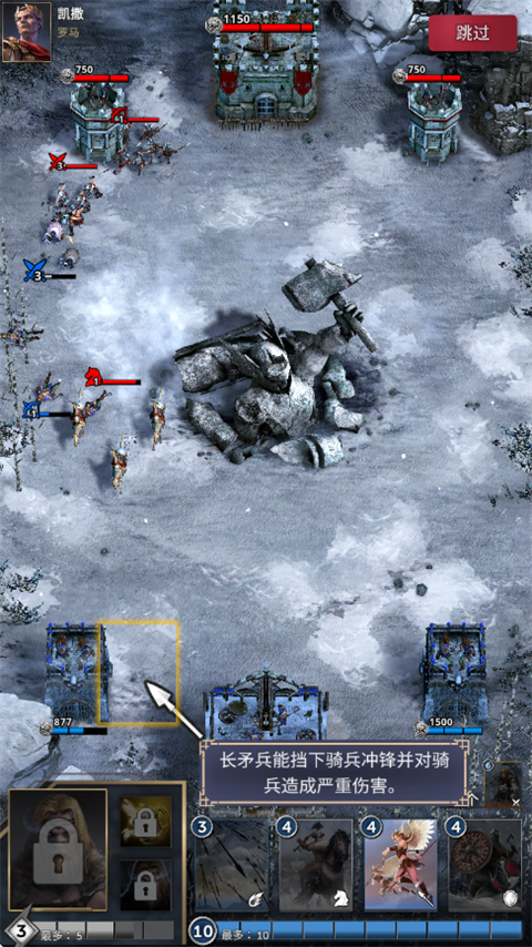 3、遇到骑兵逼近,部署女武神来阻挡他们,长矛兵能挡下骑兵冲锋并对骑兵造成严重伤害。
