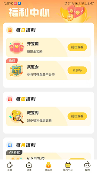 6、进入【福利中心】界面,包括每日福利、每周福利、每月福利等等不同类型的福利活动可以选择参与,