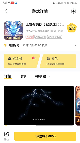 4、进入游戏详情界面,滑动屏幕我们可以了解游戏的介绍、评价、开服时间等信息,也可以领取代金券、礼包等福利,最后只需点击下载安装就可以体验了,
