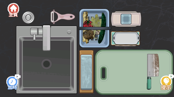 1、首先玩家进入游戏后可以看到游戏中有很多蔬菜以及很多盘子和菜刀。
