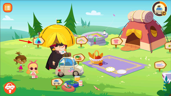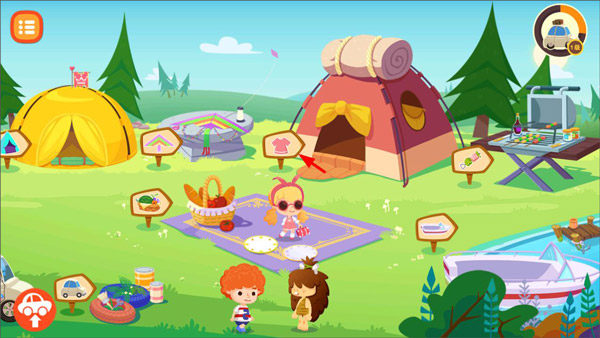 1、打开糖糖郊游记游戏,进入游戏主页面,游戏有多种玩法,可以装饰小车、搭建帐篷、乘船、钓鱼、野炊等,玩家找到服装标志点击打开;