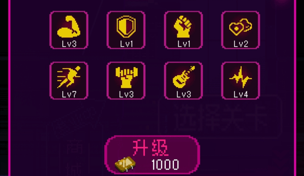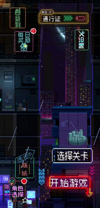游戏里的主界面中我们可以看到很多功能选项,简单分为开始游戏、卡关选择、角色选择、商店、每日礼包、通行证、设置。